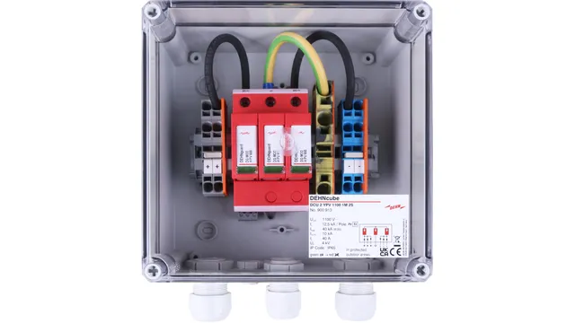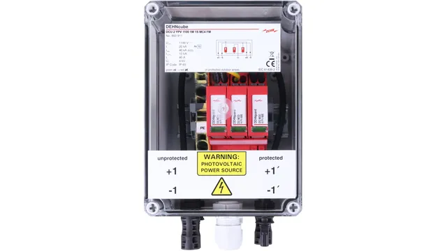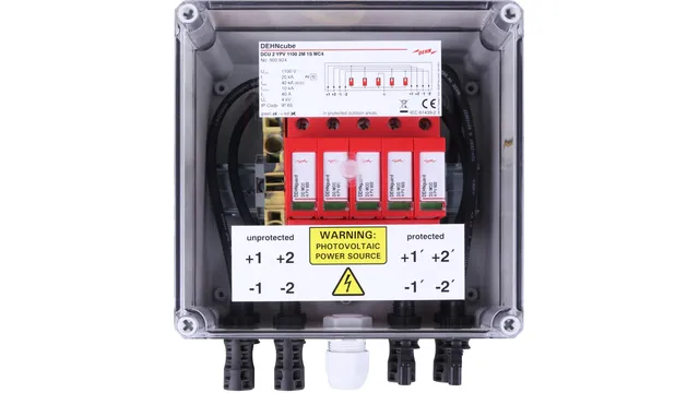 Die anschlussfertige Systemlösung DEHNcube PV schützt Wechselrichter und PV-Module vor Überspannungen. Der Generatoranschlusskasten ist für 1 MPP-, 2 MPP und 3 MPP-Anwendungen sowie für die gängigen Wechselrichtertypen verfügbar. Mit original MC4-Steckverbindung oder Schraubanschlusstechnik / Kabeleinführung.