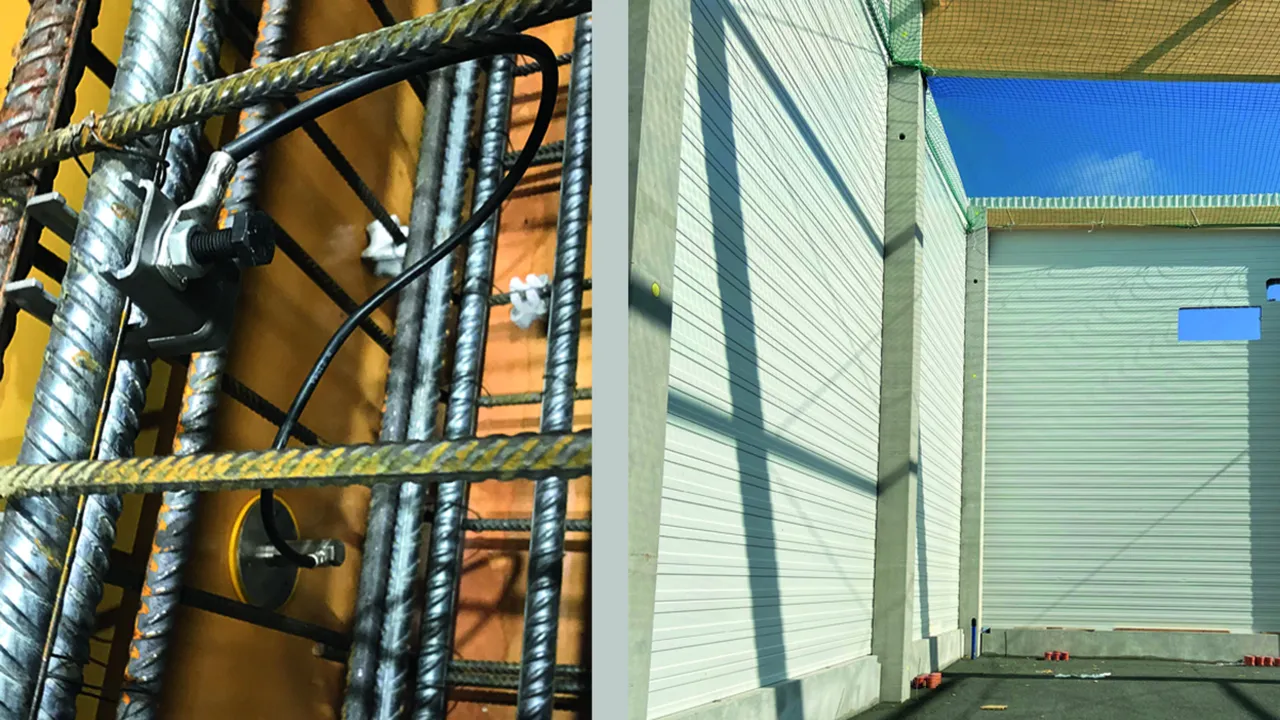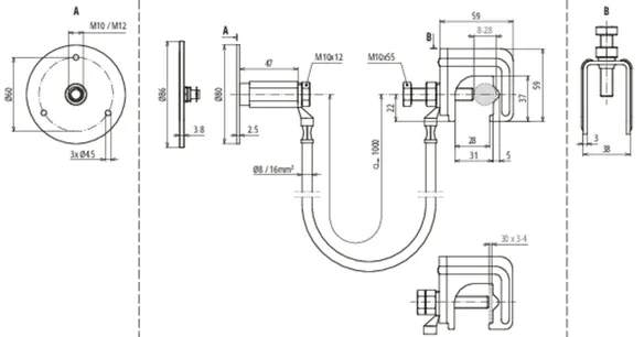 Anschluss- und Überbrückungsgarnitur zur Nutzung der Bewehrungseisen (Längseisen) von Stahlbetonstützen oder Wänden als Ableitung. Durch die Nutzung eines in den Stahlbetonstützen enthaltenen Bewehrungseisens kann die zusätzliche Installation von Rundleitern (St/tZn) für Blitzschutz / Erdung / Potentialausgleich entfallen. Die elektrisch relevante Verbindung wird über die gesamte Länge der Stahlbetonstütze durch ein vertikales Bewehrungseisen realisiert.