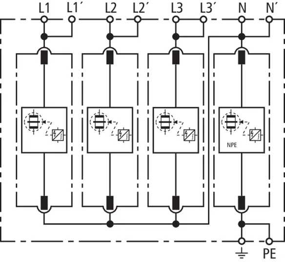 | Blitzstoßstrom (10/350 µs) [L1+L2+L3+N-PE] (Itotal ) | 100 kA |