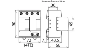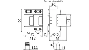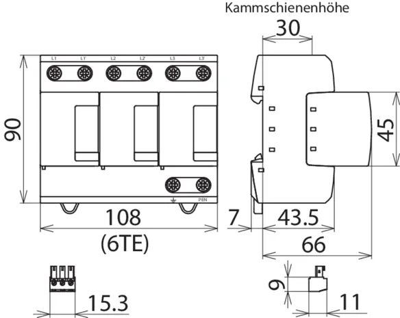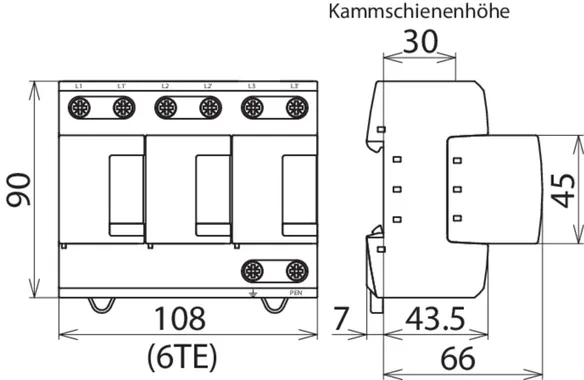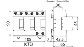 | SPD nach EN 61643-11 / IEC 61643-11 | Typ 1 + Typ 2 + Typ 3 / Class I + Class II + Class III |