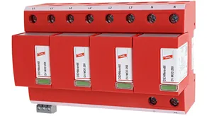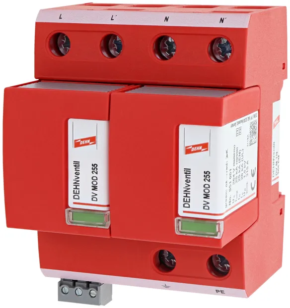 - Anschlussfertiger Kombi-Ableiter Typ 1 + Typ 2 + Typ 3 auf Funkenstreckenbasis, bestehend aus Basisteil und einem einzelnen gesteckten Schutzmodul