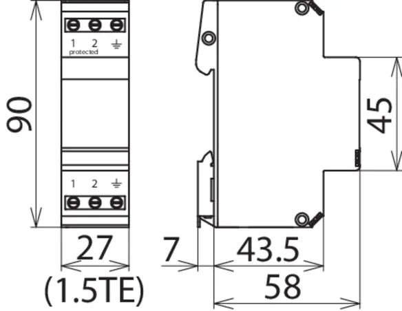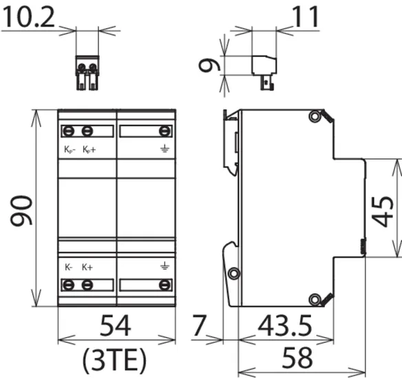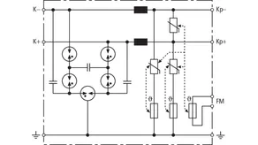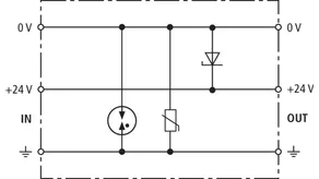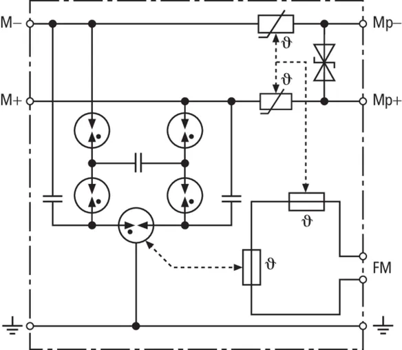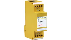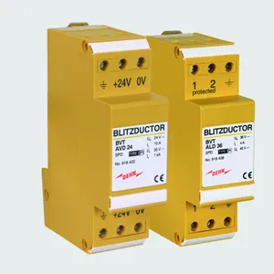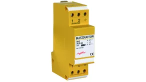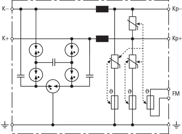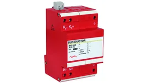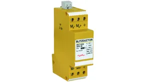 Energetisch koordinierter Kombi-Ableiter zum Schutz des Gleichrichters im Schutzstromkreis (Farbe rot). Steckbarer Fernmeldekontakt (Öffner) für Überlast-Anzeige (Thermoüberwachung der Varistoren). Einbau im Stahlblechgehäuse empfohlen. Durch kapazitive Steuerung wird eine niedrige Impuls-Ansprechspannung erreicht.