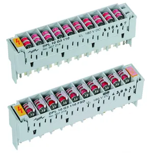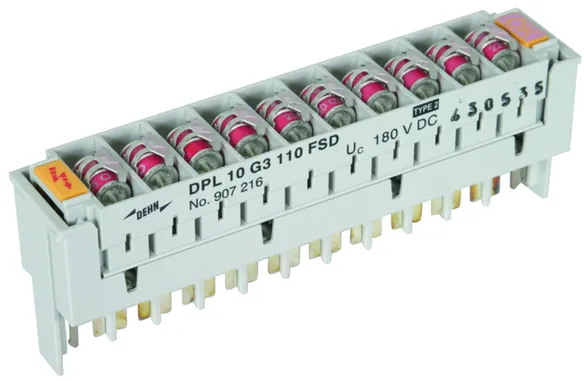 Steckmagazin für 10 DA mit dreipoligen Gasentladungsableitern für nahezu alle Anwendungen. Die Ableiter FSD verfügen über eine fail-safe-Funktion und zusätzlich eine optische Anzeige nach Auslösen des fail-safe. So kann sofort erkannt werden, ob ein Ableiter ausgetauscht werden muss.