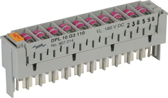 - Bereits bestückt für 10 DA mit einzeln geprüften Gasentladungsableitern