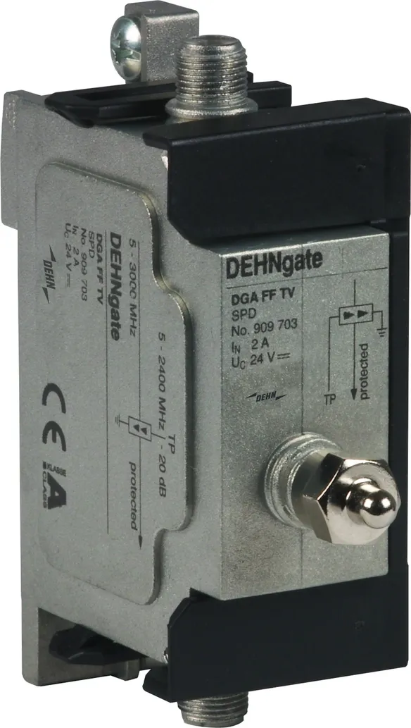 DGA ... TV sind fernspeisetaugliche Ableiter mit F-Anschluss für 75 Ohm SAT- und BK-Anlagen. Die Ableiter entsprechen den erhöhten Schirmungsanforderungen der Klasse A nach EN 50083-2. Geeignet für die platzsparende Installation in allen gängigen TV- und SAT-Anwendungen sind die Ableiter verfügbar als Blitzstrom-Ableiter sowie als Überspannungs-Ableiter oder Kombi-Ableiterset mit integriertem Messausgang zur Anlagenüberprüfung.