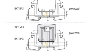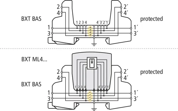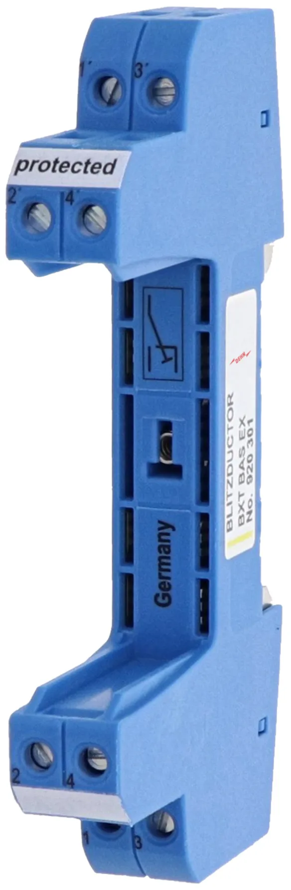 BLITZDUCTOR XT-Basisteil als sehr platzsparende, vierpolige, universelle Durchgangsklemme für eigensichere Kreise zur Aufnahme des Ableiter-Moduls ohne Signaltrennung bei gezogenem Ableiter-Modul. Die sichere Erdung des Ableiter-Moduls wird über den Hutschienen-Tragfuß mittels einer Schnappbefestigung hergestellt. Da sich keinerlei Bauelemente der Schutzschaltung im Basisteil befinden, beschränken sich Wartungsarbeiten auf die Ableiter-Module.