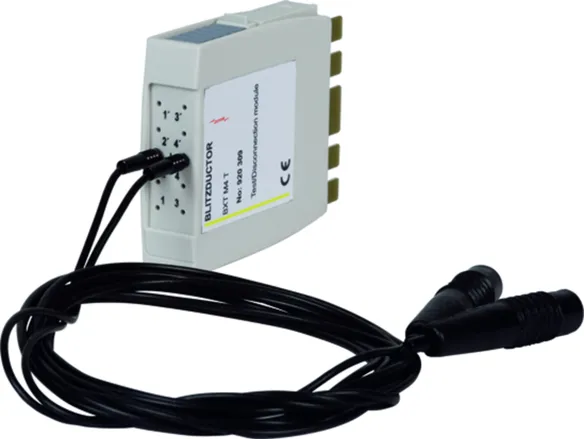 Gesteckt unterbricht das Prüf- / Trennmodul den Leitungszug der am BLITZDUCTOR SP/XT/XTU-Basisteil angeschlossenen Adern und führt diese auf eine Prüfbuchse an der Frontseite des Moduls. Dadurch ist es möglich, Messungen in der Anlage durchzuführen, ohne die Adern vom Basisteil zu lösen.