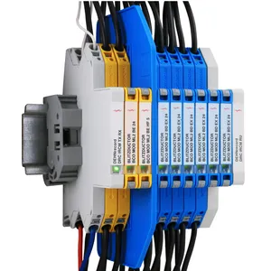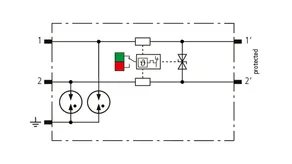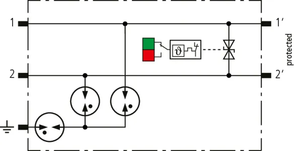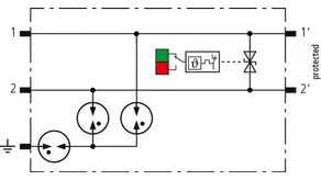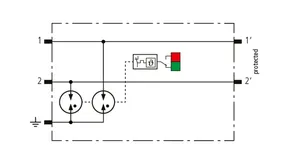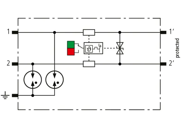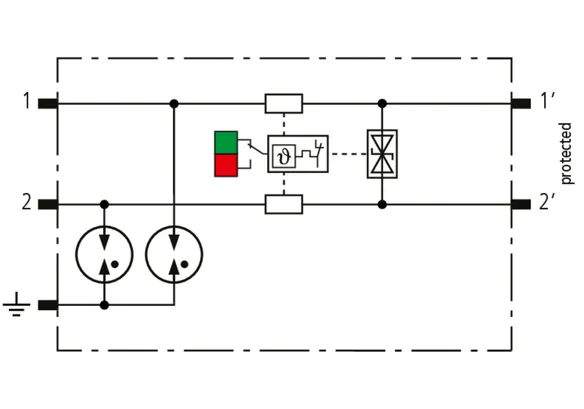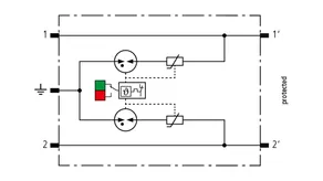 Platzsparender, modularer Kombi-Ableiter in 6 mm Baubreite und Push-In Anschlusstechnik mit Statusanzeige zum Schutz von 1 Doppelader in 24 V DC Systemen. Einsatz geeignet auch bei geerdetem Minuspol, integrierte PTC-Widerstände ermöglichen ein sicheres Rücksetzen des Ableiters nach Störbeeinflussung im Anlagenkreis mit Kurzschlussströmen bis 40 A. Mit Signaltrennung für Wartungszwecke.