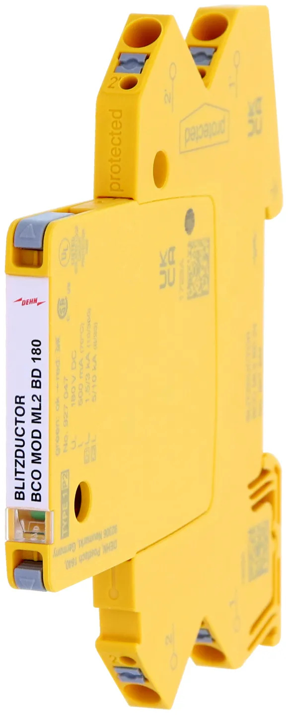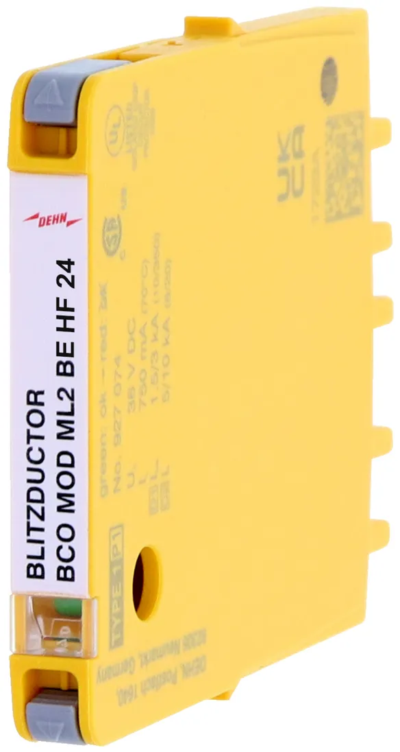 Kombi-Ableiter Schutzmodul in 6 mm Baubreite für BLITZDUCTORconnect mit Statusanzeige zum Schutz von 1 Doppelader in 24 V DC Systemen. Einsatz geeignet auch bei geerdetem Minuspol. Integrierte PTC-Widerstände ermöglichen ein sicheres Rücksetzen des Ableiters nach Störbeeinflussung im Anlagenkreis mit Kurzschlussströmen bis 40 A.