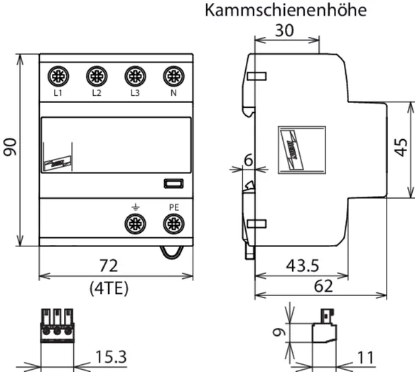 | SPD nach EN 61643-11 / ... IEC 61643-11 | Typ 1 + Typ 2 / Class I + Class II |