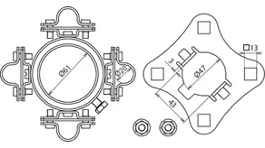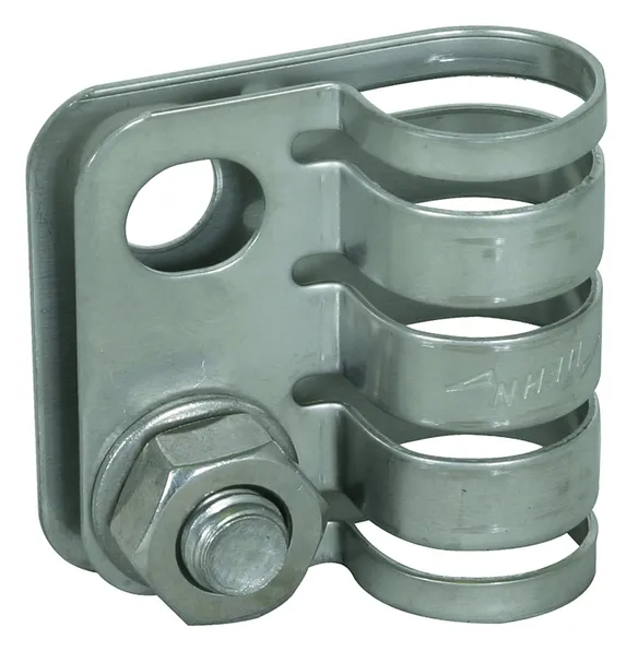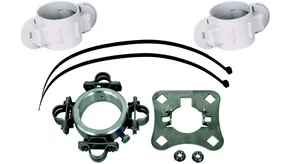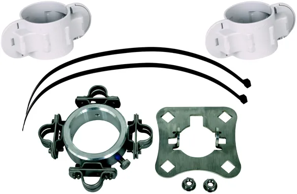 Befestigungsset zur Montage der HVI long Leitung an HVI long Stützrohren, bestehend aus Anschlussplatte (vierfach, inkl. zwei Sperrzahnmuttern) und Befestigungsring mit vier geschlitzten Leitungshaltern (Ø20 mm) für den Endverschluss (inkl. zwei Kabelbinder mit Kunststoffhalterhalbteilen).