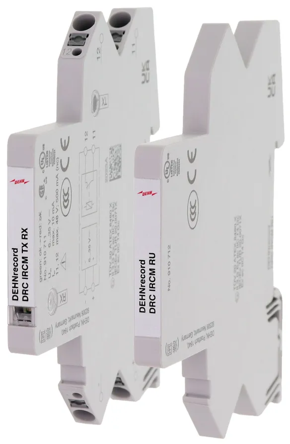 Condition Monitoring Einheit DEHNrecord, Hutschienengeräte-Set mit integriertem optischen Sender/Empfänger sowie optische Umlenkeinheit für die zustandsorientierte Überwachung von Ableitern BLITZDUCTORconnect und DEHNpatch mit LifeCheck. Optische Ableiter-Zustandsmeldung über LED-Sammelanzeige kombiniert mit FM-Signalisierung (Öffnerkontakt).