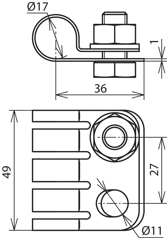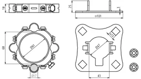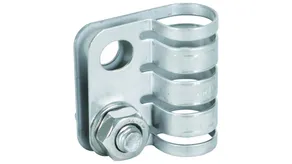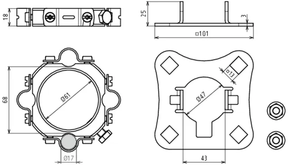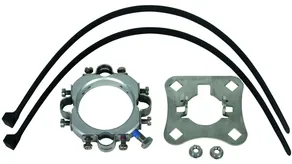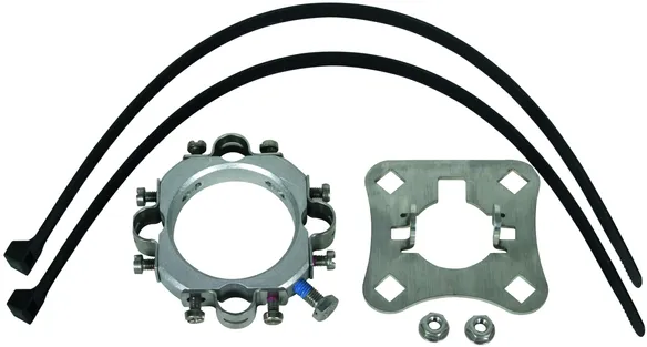 Befestigungsset zur Montage der HVI light Leitung am Stützrohr Ø50 mm (z. B. HVI long Stützrohr), bestehend aus Anschlussplatte (vierfach, inkl. zwei Sperrzahnmuttern) und Befestigungsring mit vier geschlitzten Leitungshaltern (Ø17 mm) für den Anpassungsbereich (inkl. zwei Kabelbindern).