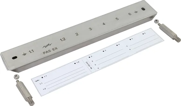 Adapter für zündfunkenfreie Ex-Potentialausgleichsschiene PAS EX zum Anschluss eines Flachleiters. Einsatz in explosionsgefährdeten Bereichen Ex-Zonen 1 und 2 (Gase, Dämpfe, Nebel) bis Explosionsgruppe IIC sowie Ex-Zonen 21 und 22 (Stäube). Einsatz sowohl im Innenbereich als auch im Außenbereich zulässig.