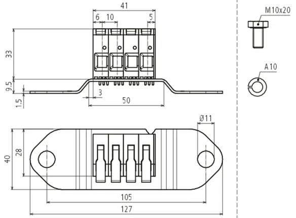 | Max. Kurzschlussstrom (AC 50 Hz / DC / 5 s) St/tZn 30x3,5 mm / 40x5 mm | 1500 A / T4 |