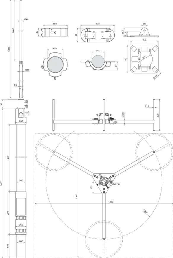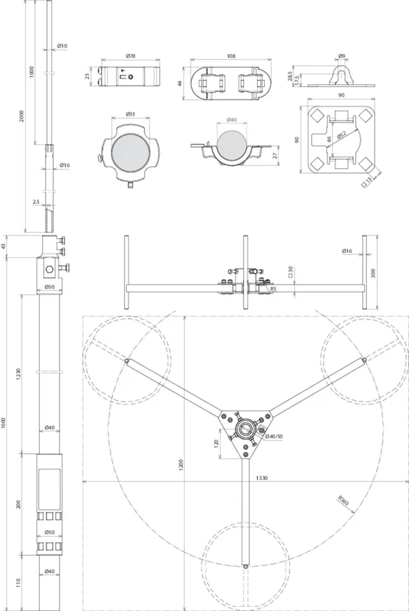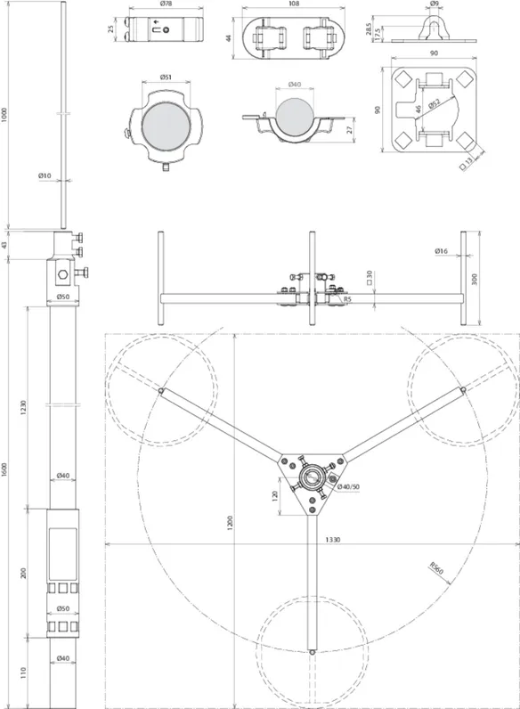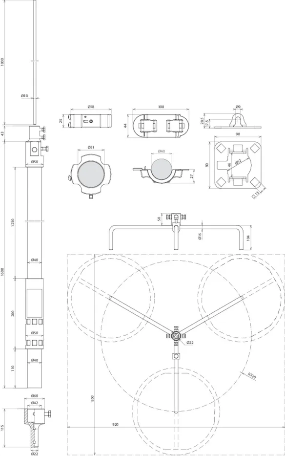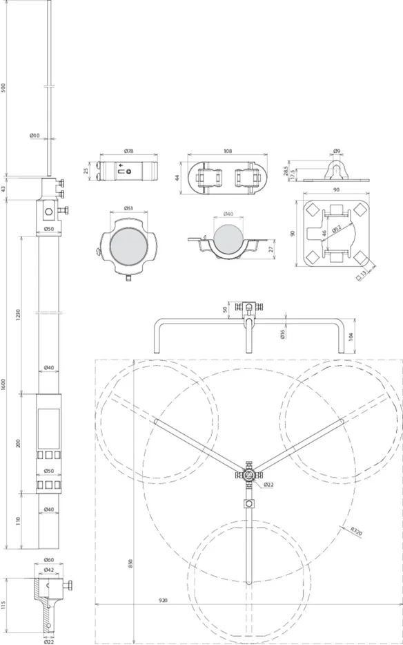 Komplettes Set bestehend aus Fangspitze / -stange, Stützrohr, Befestigungsset (inkl. Anschlussplatte, Kunststoffhaltern, Kabelbinder und PA-Abgriff) und Stativ.